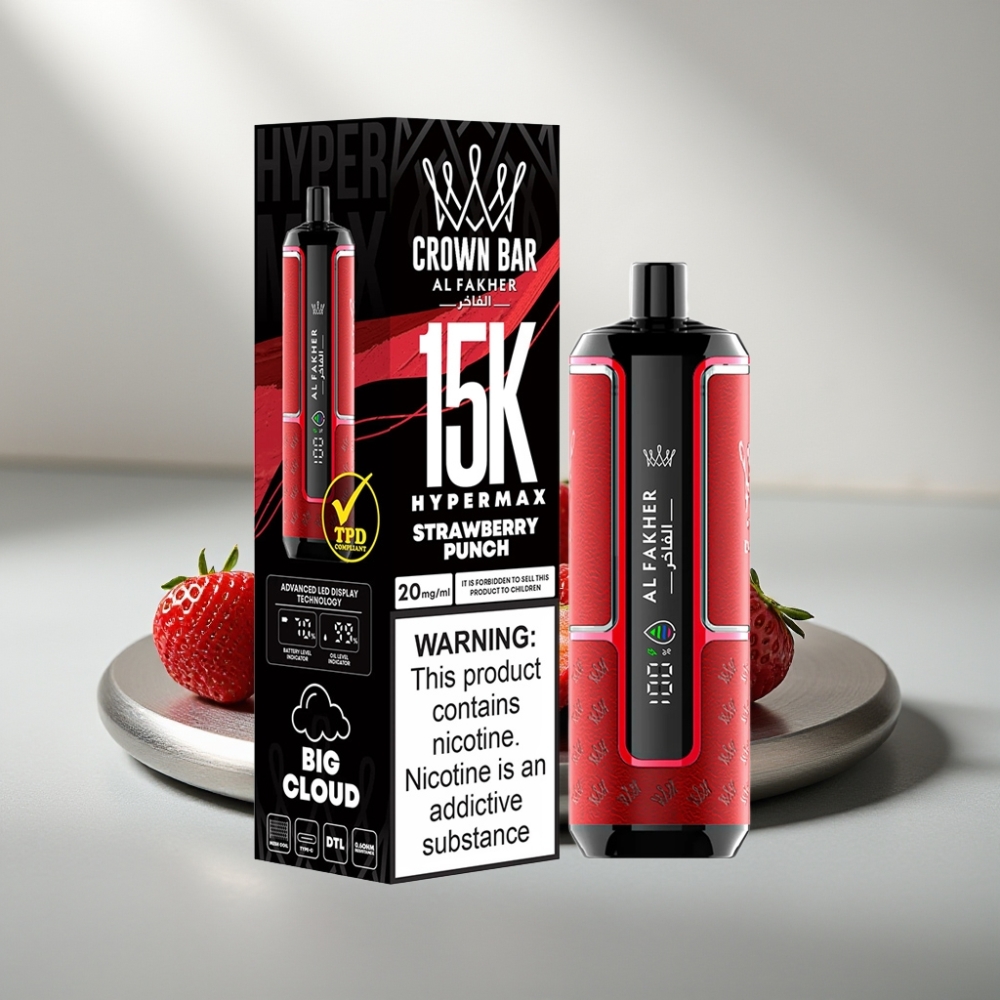 ה-Al Fakher Crown Bar 15K Hypermax הוא הבחירה המובילה למחפשי איכות, נוחות וטעם מעולה. זמין במגוון טעמי פירות ומנטול מרעננים.